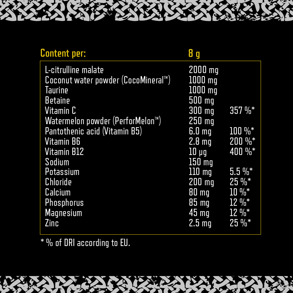 Varje portion innehåller bland annat 2000 mg L-Citrullin Malat, 1000 mg kokosvattenpulver, 1000 mg taurin och 500 mg betain. Tillsammans med B-vitaminer, kalium, magnesium och zink ger denna formula ett komplett stöd för optimal vätskebalans och återhämtning.